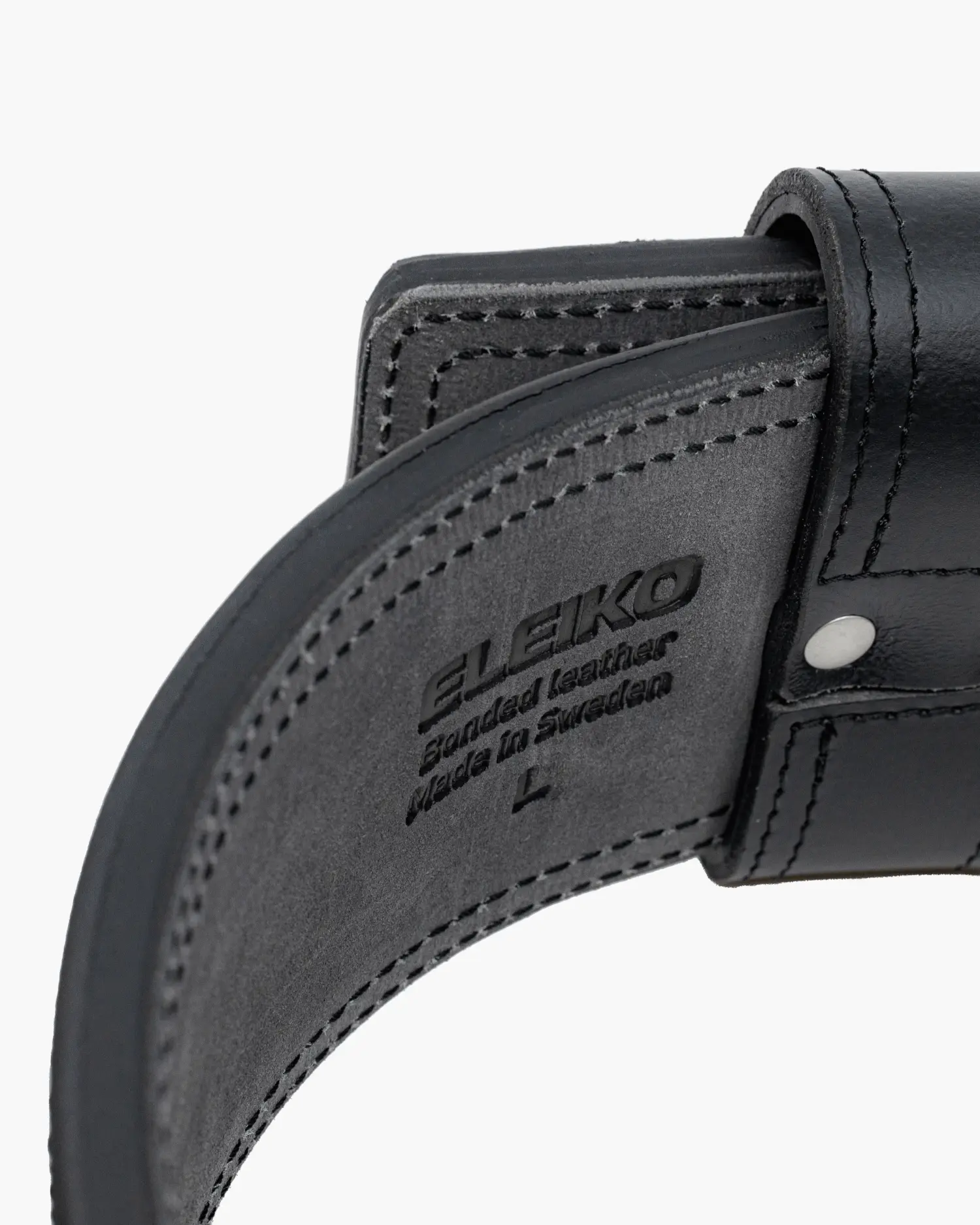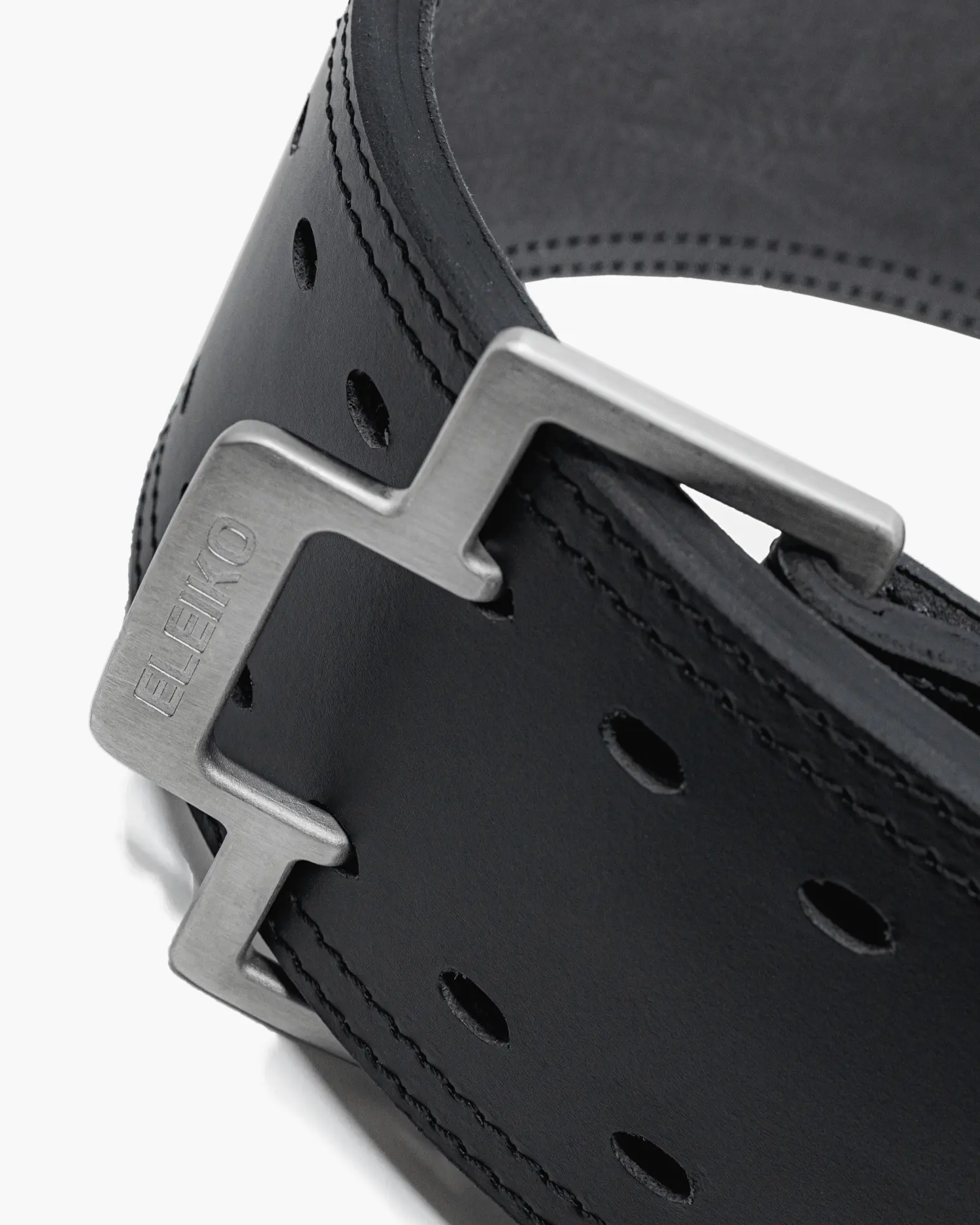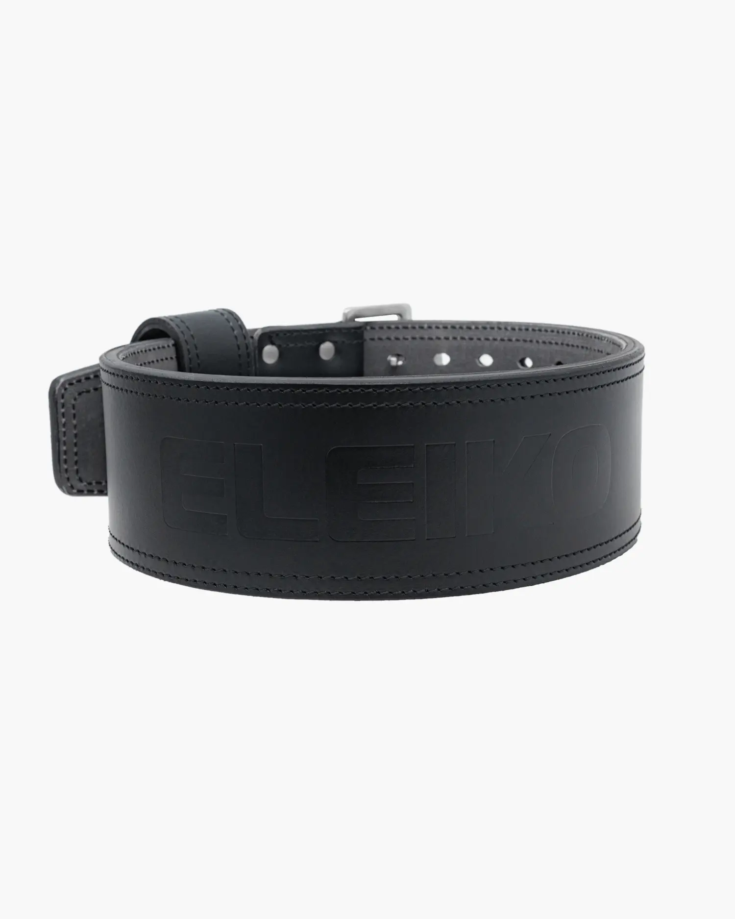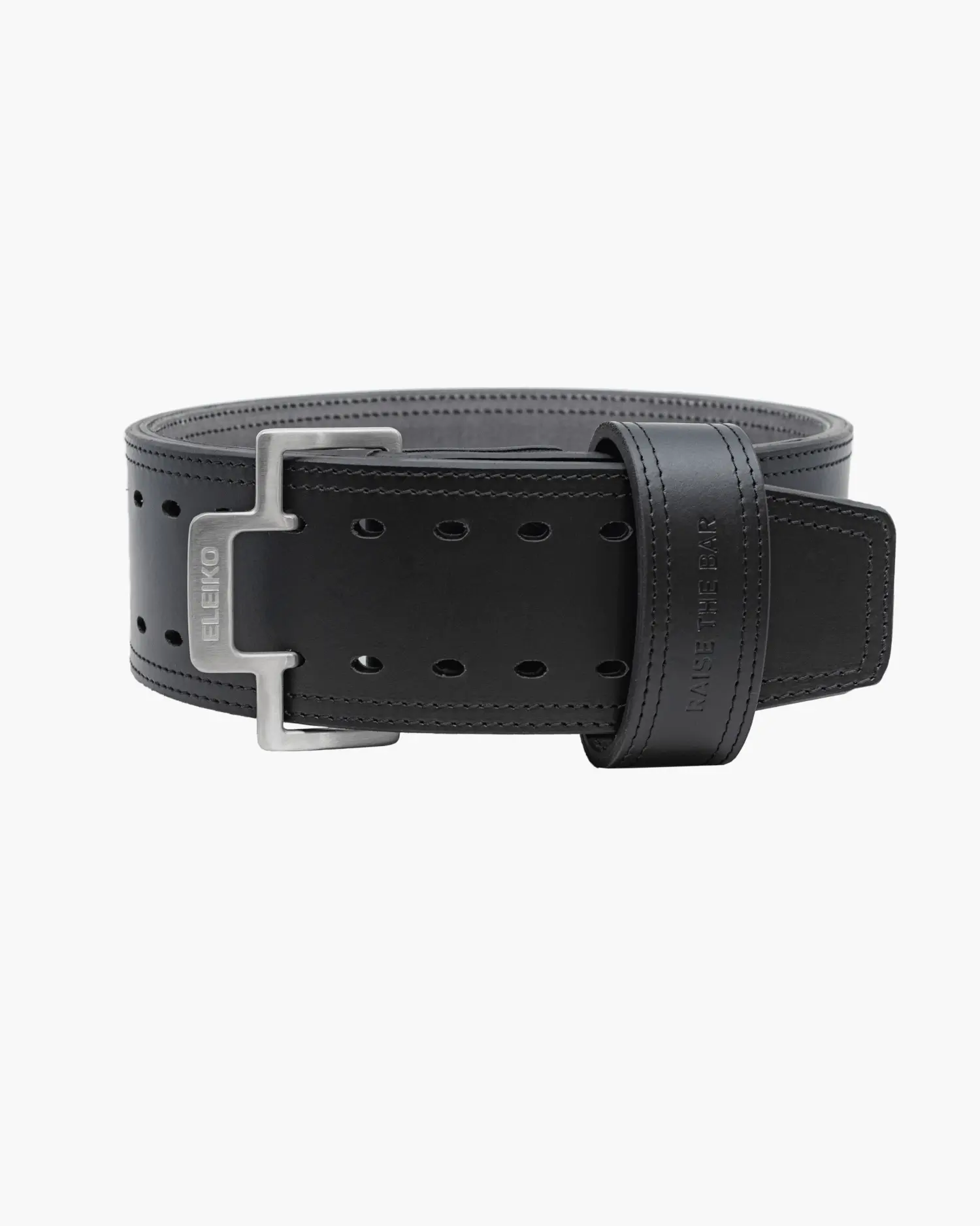 - Eleiko Details: The Eleiko Powerlifting Belt features a double-stitched edge seam, an embossed Eleiko logo at the back of the belt, a two-pronged stainless-steel buckle with an Eleiko logo, and the Raise the Bar tagline embossed in the belt loop.