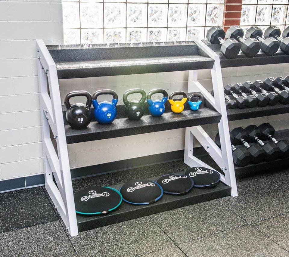 This Pendulum dumbbell rack shelf options provides perfect storage for Kettlebells.